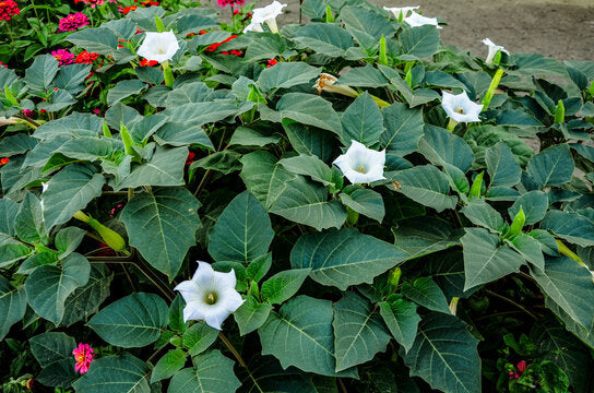 Grown as annual shrub-shaped decorative flowers. Blooms throughout the summer. Grows up to 150 cm in height. Blooms are up to 20 cm long, large, trumpet-shaped. Grows and blooms well in a sunny, warm place, in fertile soil. In autumn it is recommended to dig the plants and store them at a temperature of +8-12 °C and to plant them again in flower gardens in spring. Before sowing, the seeds should be soaked for 24 hours in +30 °C water. Seed germination is difficult and long. Keep out of reach of children as all parts of the plant are poisonous.